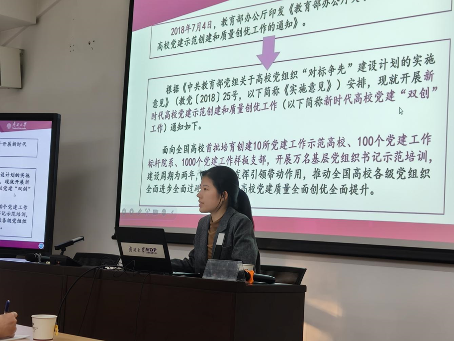 刘畅首先介绍了高校党组织“对标争先”建设计划、高校党建示范创建和质量创优工作情况,解读了总体要求、建设目标和主要任务。接着,她系统梳理了高校党建示范创建和质量创优工作的推进路径,已示范高校“六个过硬”、标杆院系“五个到位”和党支部的“七个有力”为框架,详细剖析党建工作体系的构建。她强调,夯实基础是前期,凝练特色是要求,业务融合是突破,要对标对表找差距不足,立行立改,要继承发扬南开党建传统,挖掘业务资源,体现南开特色,要形成可复制可推广的工作模式、工作经验。最后,她结合申报实例,对申报的方式方法和重点关注点进行阐释,开展实操指导。