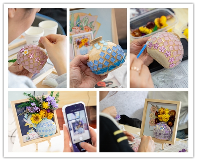 活动现场,五彩斑斓的马赛克碎片、素净雅致的花瓶基底与专业工具整齐陈列。在专业老师的指导下,女教职工们充分发挥想象力与创造力,将一颗颗色彩缤纷的马赛克精心拼贴于瓶身之上。从图案设计到色彩搭配,从碎片粘贴到填缝打磨,大家或低头专注创作,或相互交流心得,在指尖流转间赋予普通花瓶独特的艺术生命力。经过一个多小时的精心制作,一件件风格迥异、精美绝伦的马赛克花瓶陆续呈现,或清新淡雅,或绚丽夺目,承载着创作者对美好生活的热爱与期许。